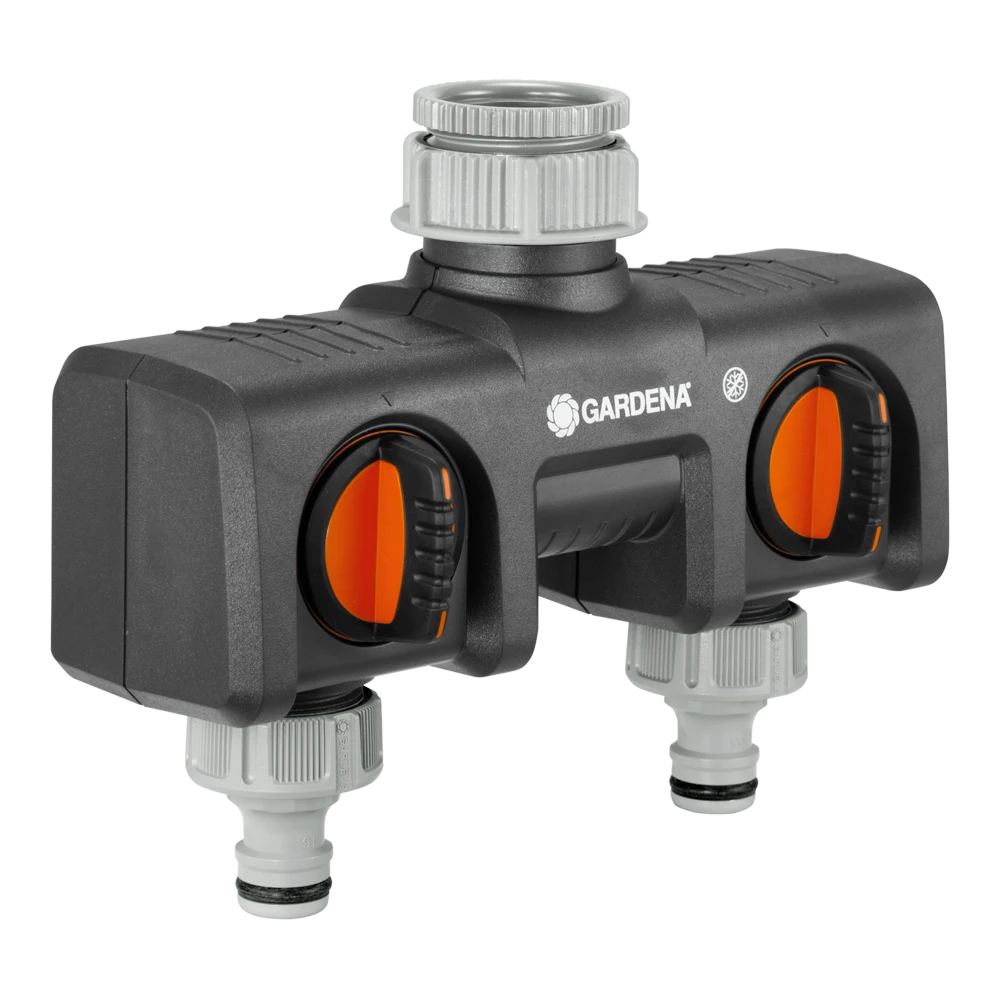 Met De GARDENA 2-weg-waterverdeler kunt u gelijktijdig twee accessoires aansluiten op één kraan. De uitgangen zijn traploos regelbaar. Op de verdeler kunnen twee GARDENA besproeiingscomputers of watertimers worden aangesloten. De 2-weg-waterverdeler kan met het Prof-System kraanstuk (art.nr. 2801-20) worden omgezet in het GARDENA Prof-System voor een grotere waterdoorvoer. De GARDENA 2-weg-waterverdeler is geschikt voor 26,5 mm (G3/4)-waterkraan met en 33,3 mm (G 1)-draad en 21 mm (G 1/2)-waterkraan met 26,5 mm (G 3/4)-draad.