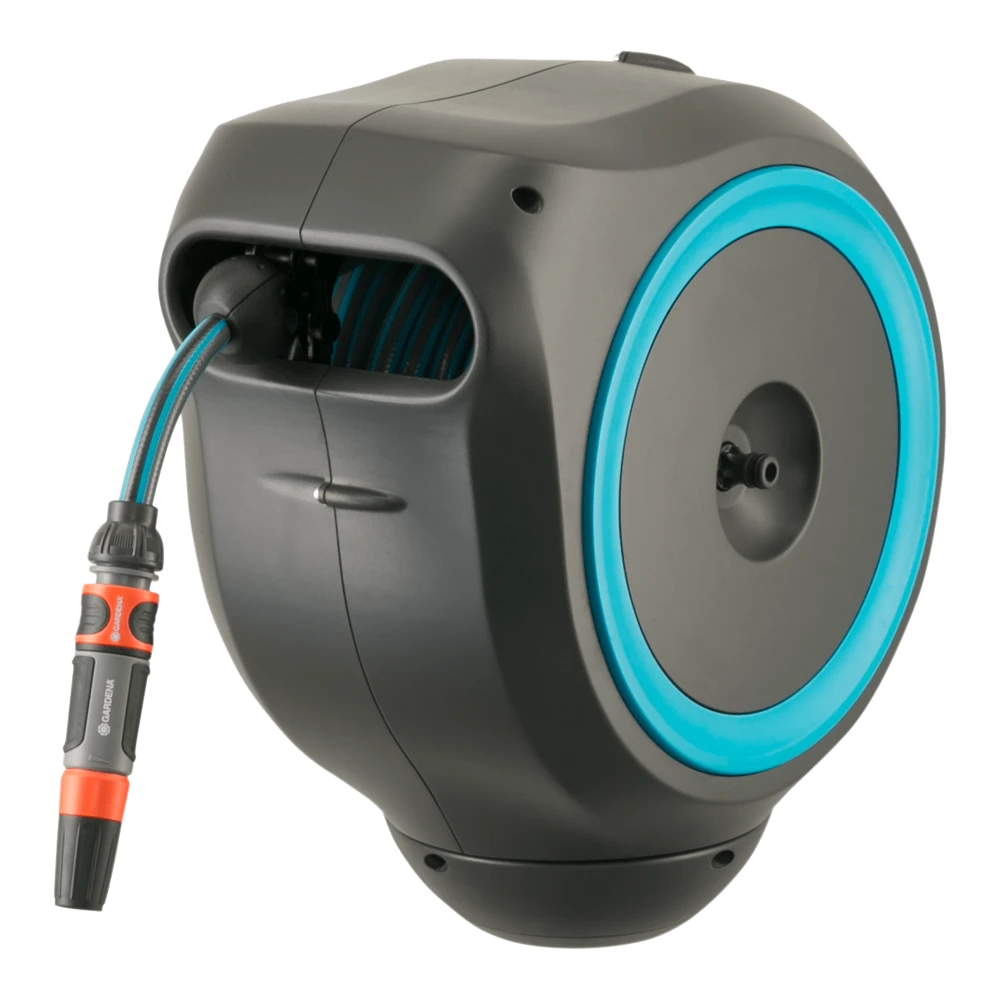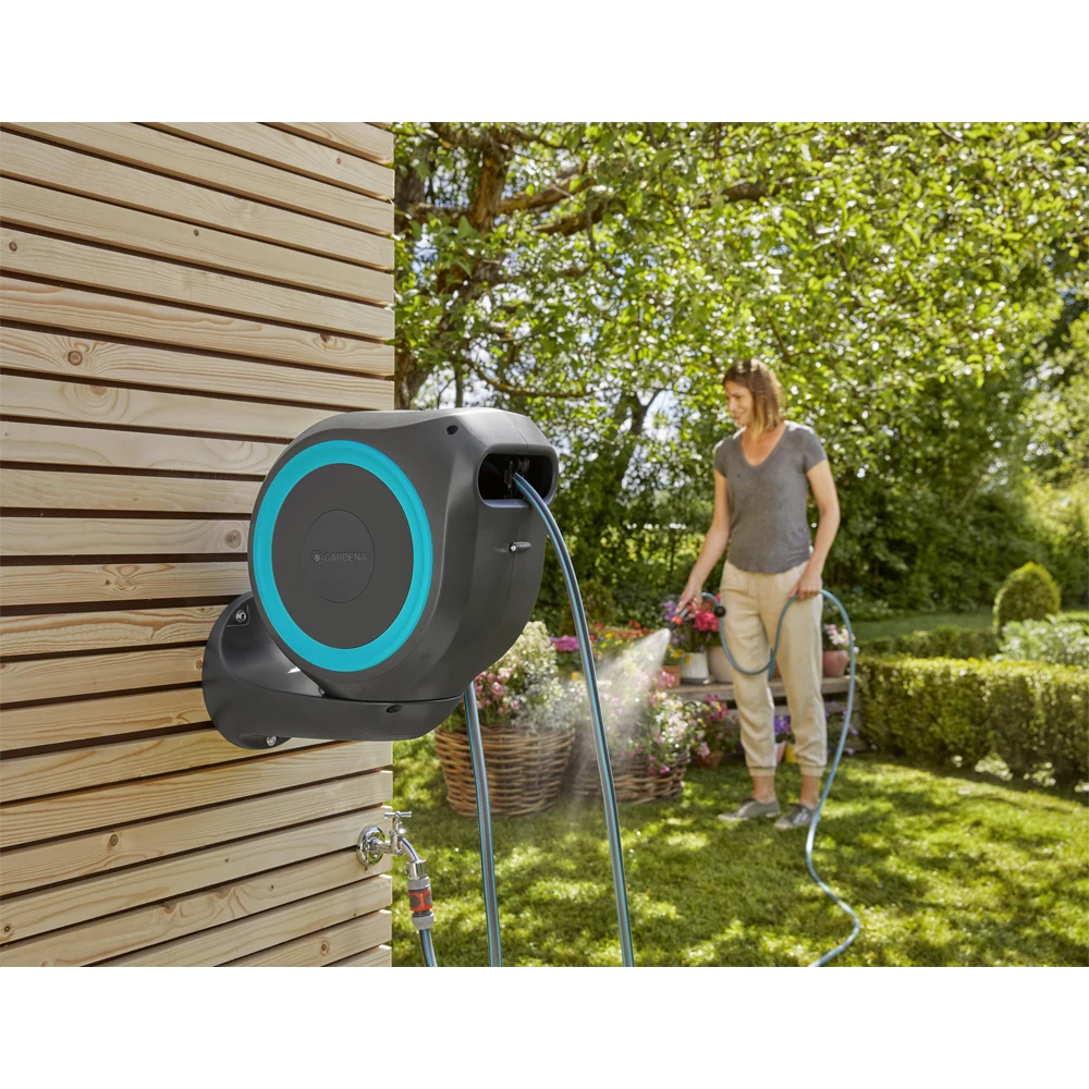 Tuinieren is handiger en gemakkelijker dan ooit met de wandslangenbox RollUp S. Deze helpt uw tuin netjes en opgeruimd te houden en voorkomt hinderlijk struikelgevaar als gevolg van een rondslingerende slang. De praktische slangopslag is eenvoudig aan de muur van uw huis te bevestigen en wordt met een flexibele aansluitslang aangesloten op de kraan. Dankzij de stevige muurbeugel kan de slangenbox meer dan 180 graden worden gedraaid, zodat u elke hoek van uw tuin moeiteloos kunt bereiken. Voor direct gebruik kunt u de tuinslang eenvoudig verlengen tot een lengte van maximaal 15 meter. De tuinslang wordt automatisch in heel korte intervallen vergrendeld zodra u stopt, wat betekent dat de slang eenvoudig en gemakkelijk te hanteren is. Door lichtjes aan het uiteinde van de slang te trekken, wordt de vergrendeling ontgrendeld en een ingebouwde stalen veer met innovatieve RollControl-technologie zorgt voor soepel en gecontroleerd oprollen. De RollControl beschermt de slangenbox en de omgeving tegen schade als gevolg van het te snel inrollen. Om knikken of knopen in de slang te voorkomen, heeft de box een geïntegreerde slanggeleider. Dankzij de slang- en kraanaansluitingen van het Original GARDENA System kunt u eenvoudig en flexibel een verlengstuk of ander compatibel GARDENA element op de slang aansluiten. U hebt altijd uw GARDENA slangopzetstukken bij de hand. Ze kunnen onder de muurbeugel worden bevestigd en daar worden opgeborgen om ruimte te besparen. De GARDENA wandslangenbox is UV- en vorstbestendig en kan het hele jaar door probleemloos aan de muur van het huis blijven bevestigd. Het hoogwaardige materiaal biedt u een lange levensduur en gebruiksgemak zonder onderhoud. Bovendien kan de box niet worden gestolen dankzij de antidiefstalbeveiliging en kan de box alleen door u van de muur worden verwijderd. Samen met de wandslangenbox ontvangt u een muurbeugel, een flexibele aansluitslang, alle benodigde Original GARDENA System en montageonderdelen en een mondstuk met twee verschillende sproeiopties. Bewatering die altijd gebruiksklaar is , dankzij de GARDENA wandslangenbox RollUp S.